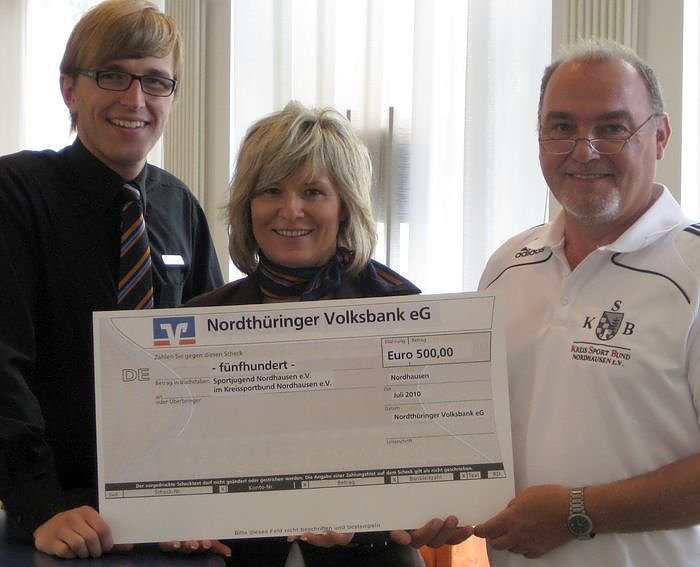 Somit konnte Klaus Gorges, Vorsitzender der Sportjugend, einen Scheck über 500 Euro für die Jugendarbeit in den Sportvereinen des Landkreises entgegen nehmen. Der Kreissportbund möchte sich auch im Namen der Sportvereine des Landkreises Nordhausen bei der Nordthüringer Volksbank recht herzlich bedanken und freut sich auf eine weitere gute Zusammenarbeit.