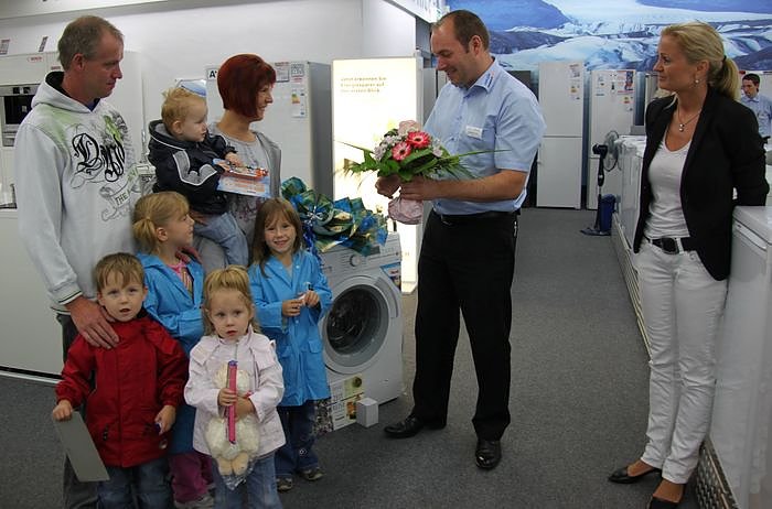 Familie Lange und Rediske hat ihre Waschmaschine auch von Anja Maucher und von Sebastian Kropp, Filialleiter in der Südharzgalerie bekommen