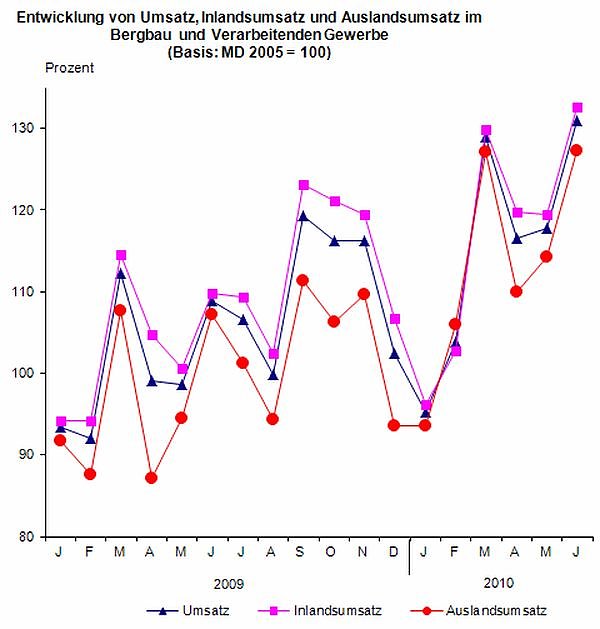 Beim Geschäft mit den inländischen Abnehmern wurde im Juni 2010 zum Vorjahresmonat ein Umsatzanstieg um 270 Millionen Euro bzw. 20,8 Prozent ermittelt. In den ersten sechs Monaten dieses Jahres betrug der Inlandsumsatz 8,3 Milliarden Euro, 13,3 Prozent mehr als im Vorjahreszeitraum.
