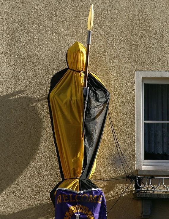 Nun steht er da, der Riese. Er ist verhüllt in den städtischen Farben, versehen mit der Fahne des Lions-Clubs. Wenn Sie bei der Enthüllung heute dabei sein wollen, dann sollten Sie jetzt nur einmal klicken...