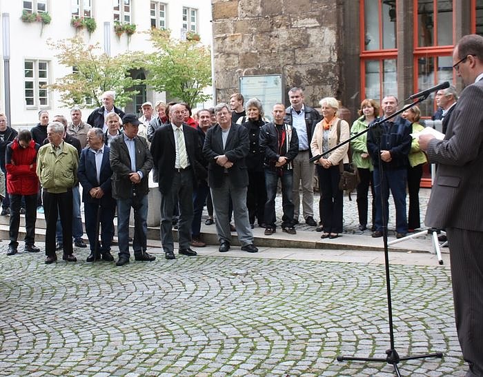 Vor der Gedenkstele am Rathaus gedachten heute Bürgermeister Matthias Jendricke (SPD), Landrat Joachim Claus (CDU), Vertreter der Fraktionen des Stadtrates und Bürger der Stadt mit einer Kranzniederlegung dem Kriegsbeginn vor 71 Jahren.