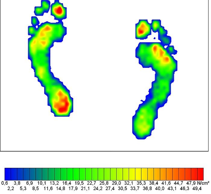 Im Messprotokoll gut zu erkennen: Die roten Flächen des Fußes stehen unter besonders hoher Belastung. Hier können orthopädische Schuheinlagen zur Fußgesundheit beitragen