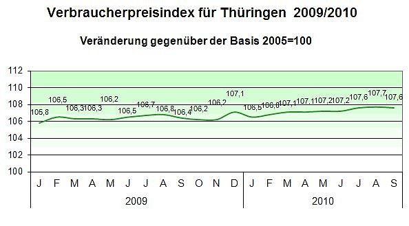 Der Verbraucherpreisindex sank im Monat September gegenüber dem Vormonat August um 0,1 Prozent. Er erreichte einen Indexstand von 107,6 Prozent (Basis 2005=100). Die Jahresteuerungsrate stieg nach Mitteilung des Thüringer Landesamtes für Statistik von 0,8 Prozent im August auf 1,1 Prozent im September.
