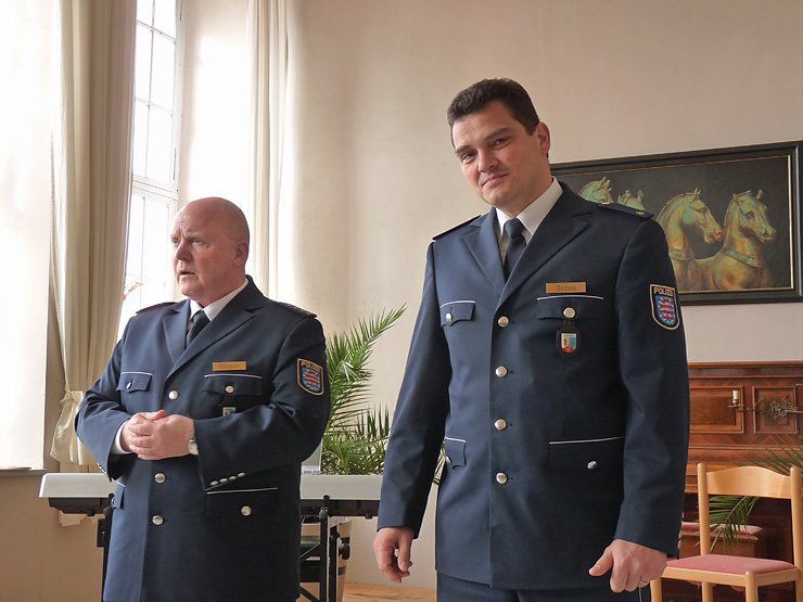 Ronny Groos (r.) wurde im Rahmen einer Festveranstaltung in der Orangerie Bendeleben durch den Chef der Polizeidirektion Nordhausen, Uwe Köppen, vorgestellt. Hartmut Wachtel, "Neuer" für Sondershausen konnte wegen Erkrankung nicht an der Festveranstaltung teilnehmen.