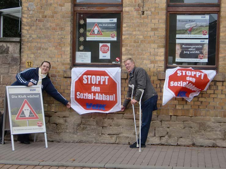Der 1.105 Mitglieder zählende VdK-Kreisverband Nordthüringen (31.08.2010) beteiligt sich deshalb an der bundesweiten Protestkampagne, die der größte deutsche Sozialverband diesen Herbst unter dem Motto "Stoppt den Sozial-Abbau!" bundesweit durchführt. Und er appelliert an die Bundestagsabgeordneten Johannes Selle (CDU), Kersten Steinke (DIE.LINKE), Steffen-Claudio Lemme (SPD), Patrick Kurth (FDP), Manfred Grund (CDU), die in dem offenen Brief vorgebrachten Argumente in die bevorstehenden parlamentarischen Diskussionen einzubringen und den Sozialstaat als "ein Modell der Zukunft" zu bewahren.