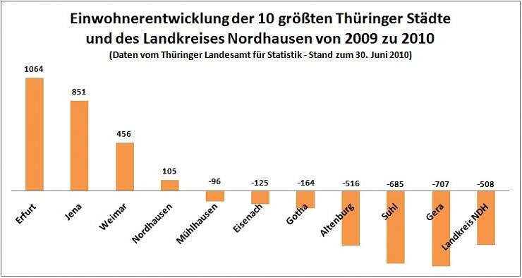Autor: nnzDarstellung der Bevölkerungsveränderungen in den zehn größten Thüringer Städten zum 30. Juni 2010. Quelle der Zahlen: Thüringer Landesamt für Statistik