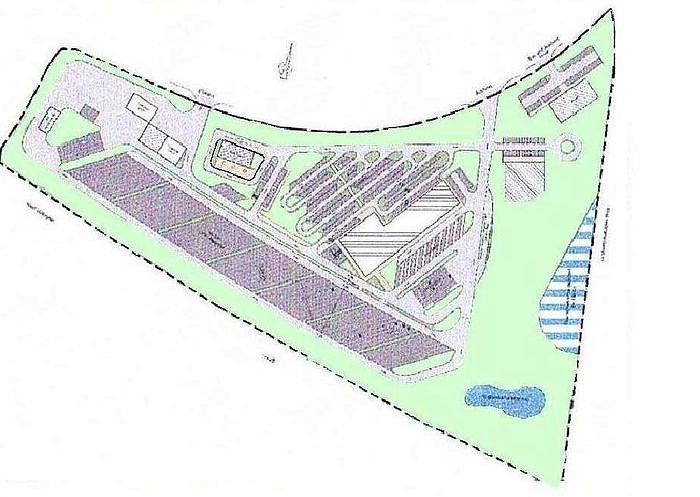 Die Parkflächen sind dunkelgrau, die Gebäude sind rot, rechts oben ein Hotel, welches laut Mitteilung aus der Stadtverwaltung an Mitglieder der BI aber schon wieder verworfen wurde, was dafür gebaut werden soll, wurde nicht verraten. Dieses Gebäude (Hotel) soll eine Bauhöhe von 12 Metern haben. Die beiden anderen Gebäude rechtsseitig, mit Erlebnis gekennzeichnet sind im Planungsentwurf mit Entertainment Center und Shop bezeichnet, haben eine Bauhöhe von acht Metern, alle anderen Gebäude eine Höhe von höchstens sechs Metern.