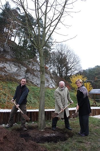 Eine neue Kastanie schmückt seit heute den Spielplatz in Nordhausens Ortsteil Steigerthal. "Spendiert" hat das neue Grün ein Verband, der im Landkreis Nordhausen agiert...Eine neue Kastanie schmückt seit heute den Spielplatz in Nordhausens Ortsteil Steigerthal. Ortsbürgermeisterin Karin Busch und Ulrich Schardt (Mitte), Geschäftsführer des Wasserverbandes Nordhausen, setzten das Gewächs heute mit dem Vertreter der Baumschule (links) in die Erde. Der Baum wurde mit Unterstützung des Wasserverbandes erworben und gepflanzt.