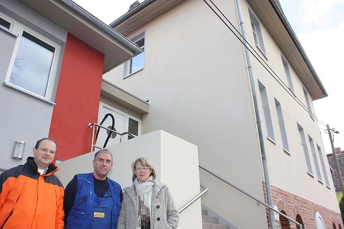 Autor: nnzVon rechts: Inge Klaan, Ortsbürgermeister Andreas Kruse und Heiko Müller vom Bauamt vor dem neuen Dorfgemeinschaftshaus