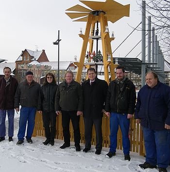 Es gab noch eine weitere Überraschung für die Bürger der Einheitsgemeinde Ellrich: Eine Weihnachtspyramide wurde pünktlich zum Ellricher Weihnachtsmarkt fertig gestellt und gut sichtbar am Marktplatz aufgestellt. Absender ist der Horizont-Verein. Im Beisein aller Mitwirkenden wurde die Übergabe durch den Werksstattleiter, Herrn Fuhrmann an die Repräsentanten der Stadtverwaltung Ellrich übergeben. Jedermann ist recht herzlich eingeladen, sich selbst ein Bild von der Pyramide zumachen.