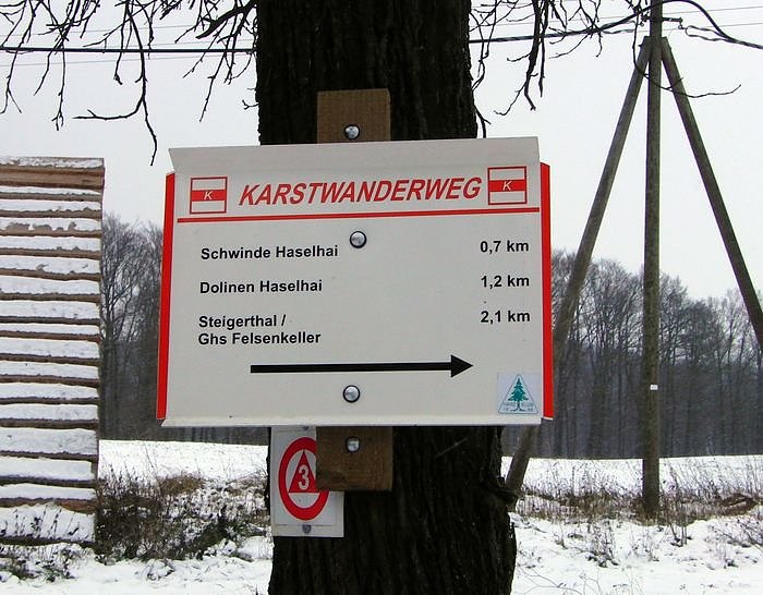 Im Gebiet gehört der Karstwanderweg zu den wenigen, einigermaßen gut ausgeschilderten Wanderwegen. Die Situation hat sich hier in den letzten Jahren weiter verbessert. Dennoch stellen Teilnehmer meiner Hunderter, also allesamt "Wanderprofis", immer wieder fest, dass sich die Nordhäuser Markierer in ihrer Arbeit offenbar nur selten von der Sichtweise der Wanderer leiten lassen. Da fehlen Markierungen an Abzweigungen oder sie werden an nur schwer zu erkennenden Stellen angebracht. Das trifft mitunter auch noch auf den Karstwanderweg zu.