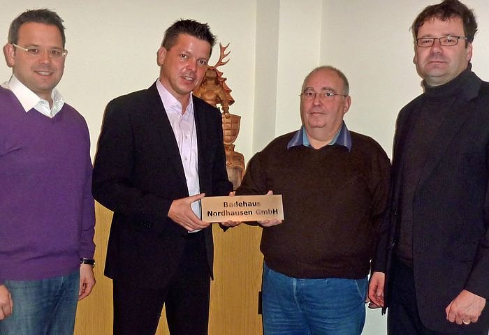 Bürgermeister Frank Rostek hieß Jens Eisenschmidt, Geschäftsführer der Badehaus Nordhausen GmbH gestern im Bleicheröder Rathaus herzlich willkommen. Es ging in dabei in erster Linie nicht ums erfrischende Nass...