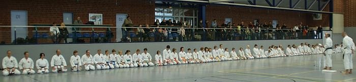 Der findet seit einigen Jahren immer im Dezember in der Zweifeldersporthalle in Kelbra statt. Am vergangenen Wochenende war es dann mal wieder so weit. Knapp 70 Teilnehmer fanden sich ein, um zu trainieren und sich auf die anschließenden Prüfungen vorzubereiten. In drei Gruppen, aufgeteilt nach den jeweiligen Graduierungen, konnte jeder Teilnehmer zwei Trainingseinheiten bei Frank Pelny (TKV-Stilrichtungsreferent, DOSB-Trainer-A Karate & Prüfer-A-Lizenz, 5. DAN Karate) sowie beim Gasttrainer aus Halle Sebastian Edelmann (Diplomsportlehrer, Physiotherapeut, DOSB-Trainer A Karate, 3. DAN Karate) absolvieren. Im Anschluss daran wurde es ernst – die Prüfungen standen an.
