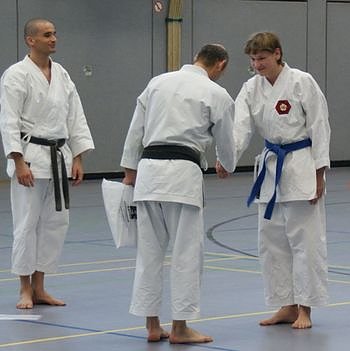 41 Karatekas mussten nun alles geben, denn geschenkt wurde ihnen trotz des nahen Festes nichts. Am Ende des Nachmittages konnte 18x der 9. Kyu (weiß/gelb), 10x 8. Kyu (gelb), 7x 7. Kyu (orange), 3x 6. Kyu (grün), 2x 5. Kyu (blau) und 1x 1. Kyu Kobudô (braun) mit einer entsprechenden Urkunde verliehen werden. Zwischendurch diente der Lehrgang noch als würdiger Rahmen für eine ganz besondere Ehrung. Einmal in jedem Monat wird innerhalb der verschiedenen Trainingsgruppen des Vereins ein kleiner Wettkampf durchgeführt.