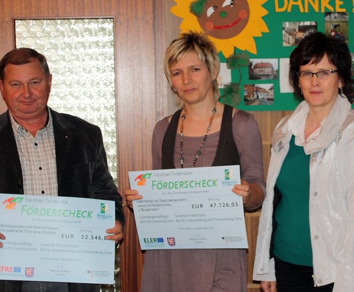 Wie in vielen anderen Bereichen mussten auch bei den LEADER-Mitteln Einsparungen hingenommen werden. Dennoch können mit fast 500.000 Euro ausgereichten Zuwendungsbescheiden wichtige Projekte umgesetzt werden, wie zum Beispiel der An- und Umbau des Dorfgemeinschaftshauses in der Gemeinde Friedrichsthal, gefördert mit gut 47.100 Euro und in Wolkramshausen konnte mit über 52.500 Euro Fördergeldern der Platz des ehemaligen Jungmannschen Gutes neu gestaltet werden. Hinzu kommen jeweils die Eigenanteile der Kommunen.