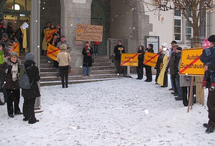 Die gestrige Stadtratssitzung war natürlich wieder gut besucht. Etwa vierzig bis fünfzig Sundhäuser waren im und vor dem neuen Rathaus zur Stelle, um klar zum Ausdruck zu bringen: Kein Autohof in Sundhausen!