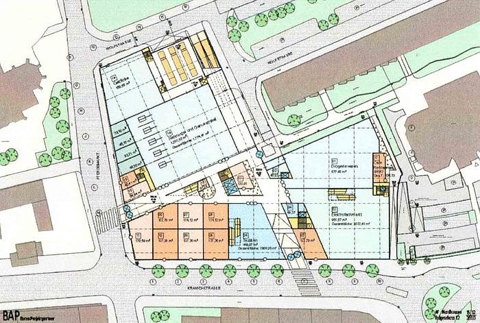 Hier handelt es sich um den Zuschnitt des künftigen Erdgeschosses, in dem unter anderen ein Verbrauchermarkt untergebracht werden soll.