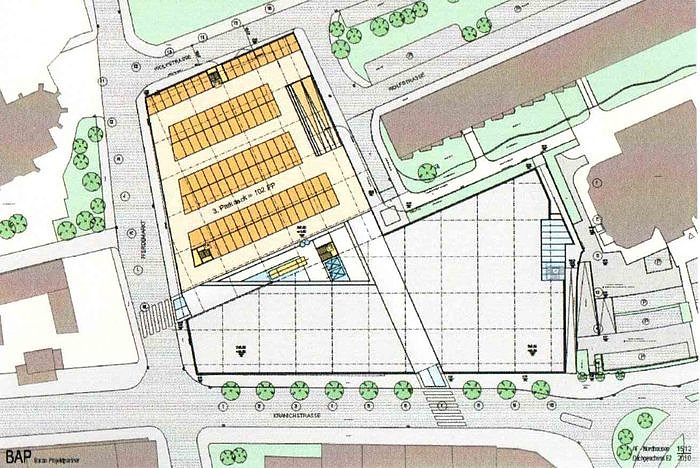 Das Dachgeschoss besteht in dieser Ansicht nur aus Parkflächen. Erweiterungen sollen jederzeit möglich sein. Wenn jetzt alles "reibungslos" über die Bühne geht, dann kann mit einer Eröffnung des Einkaufszentrums zum Weihnachtsgeschäft 2012 oder zum Ostergeschäft 2013 gerechnet werden.