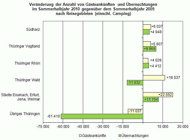 Einen wichtigen Beitrag zur positiven Entwicklung im Thüringer Tourismus lieferte im Sommerhalbjahr 2010 insbesondere der Städtetourismus. In die Beherbergungsbetriebe der Städte Eisenach, Erfurt, Jena und Weimar kamen 650.000 Gäste (+ 3,6 Prozent). Die Zahl der Übernachtungen stieg um 1,0 Prozent auf 1,16 Millionen. Die drei kleineren Thüringer Reisegebiete, der Südharz, das Thüringer Vogtland und die Thüringer Rhön hatten ebenfalls sowohl mehr Gästeankünfte als auch mehr Übernachtungen als im Vorjahreszeitraum zu verzeichnen. Den Thüringer Wald, das größte der sechs Thüringer Reisegebiete, besuchten zwar mehr Gäste (+ 2,0 Prozent), die Zahl der Übernachtungen ging jedoch um 0,4 Prozent auf 2,7 Millionen zurück.