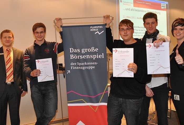 Die Gewinnerteams wurden heute von der Kreissparkasse Nordhausen ausgezeichnet. Die drei besten Spielgruppen erhielten als Auszeichnung Spargeschenkgutscheine in Höhe von 100 Euro und 50 Euro sowie Sachpreise. Außerdem sind die besten 14 Spielgruppen zu einem besonderen Ausflug nach Frankfurt/Main an die Börse im März eingeladen.