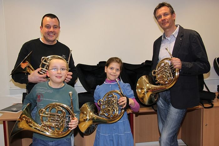 Bislang haben die jungen Schüler oft auf Hörnern für Erwachsene geübt, die deutlich größer sind, zu groß für kleine Hände – das passte, denn Schraders Sohns Julian lernt selbst seit über zehn Jahren Waldhorn in der Musikschule. Die Kinderinstrumente sind deutlich besser in der Handhabung, sagt Holger Niebhagen, der die Kreismusikschule leitet, selbst Horn studiert hat und nun unterrichtet. Das ist wirklich eine tolle Sache, gerade auch im Instrumentenkarussell. Da musste ich bislang den Kindern meist ein Erwachsenenhorn in die Hand drücken, meint Holger Niebhagen. Ich wollte unbedingt Horn spielen, so Rosa.