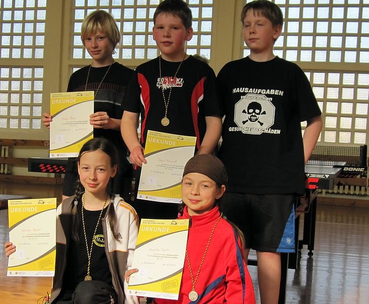 In der AK 11/12 der Mädchen gewann Caroline Penzler (v.l.) und bei den Jungen setzte sich Daniel Albrandt (h.mitte) etwas überraschend gegen Marcel Schneider von der Hydro durch. In dieser Altersklasse wurde Moritz Bock (h.r.) außerdem guter Dritter. In der AK 10 der Mädchen erreichte Charlotte Penzler (v.r.) einen sehr guten zweiten Platz. Damit haben sich diese vier jungen Sportler für den Bezirksentscheid in Friedrichroda qualifiziert. Etwas unglücklich verpasst hatten Savvas Sismanidis (AK 10) und Patrick Deistler (AK 11/12) (h.r.) die Halbfinals.