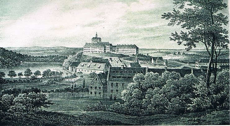 Schloss Ballenstedt vom Thiergarten aus Quelle: Thüringen und der Harz mit ihren Merkwürdigkeiten, Volkssagen und Legenden ... 7 Bände mit 84 Original-Lithographien. Sondershausen. Verlag Friedrich August Eupel, 1839-42
