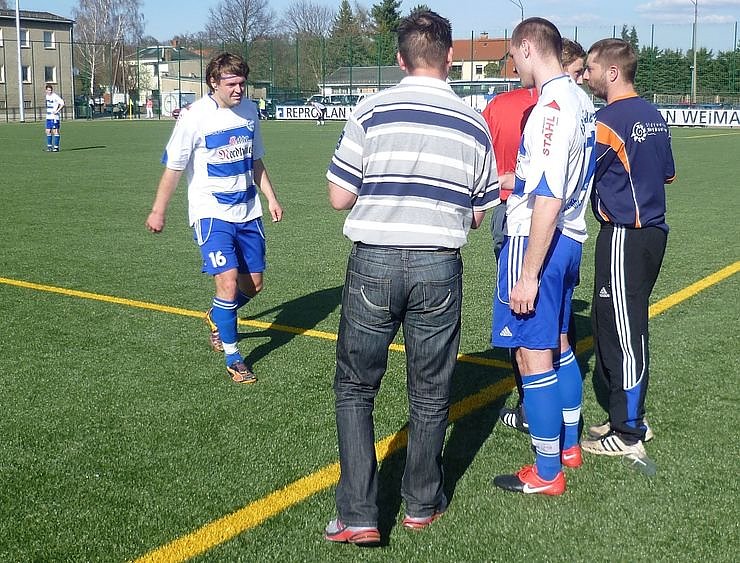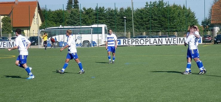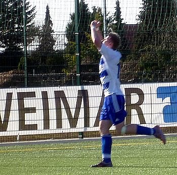 Ganz einfach war die Antwort nach dem Spiel: Immer so kämpfen wie heute, das taktische Trainerkonzept umsetzen und spielerisch so auftrumpfen. Und natürlich auch die Chancen nutzen. Da schien sich das Dilemma schon in den ersten zehn Minuten fortzusetzen. Zunächst traf Stephan Hoffmann den Freistoßball von Torsten Klaus im Torraum nicht voll und Jan-Philipp Rose konnte den Abpraller nicht verwerten (5. Minute). Eine Hoffmann-Ecke (10.) hatte dann Klaus nicht zur Führung nutzen können, der jedoch zwei Minuten später von halbrechts einen Gewaltschuss losließ, dem der Weimarer Schlussmann Felix Markert nur nachschauen konnte – 0:1. In der 16. Minute kam ein weiter Abschlag von Lars Greschke auf Rose, dessen Abschluss aber neben dem Tor landete.