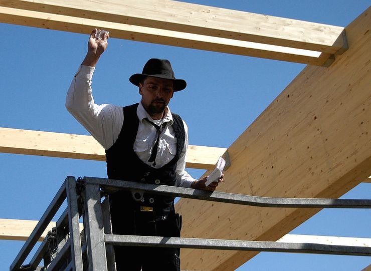 Dachdeckermeister Thomas Lange vom Bauunternehmen Henning in Urbach erhob sein Glas und weihte als Zimmermann nach alter Sitte den Rohbau auf dem Gelände des Straßenbahndepots ein