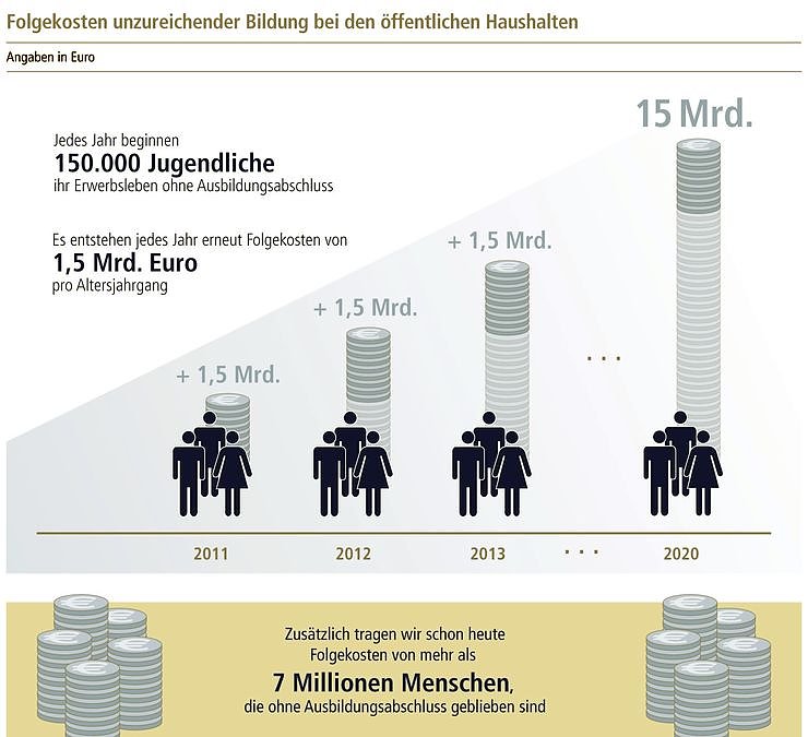 Die Berechnungen des WZB basieren auf der Annahme, dass es zukünftig gelingt, die Zahl junger Menschen ohne Ausbildungsabschluss zu halbieren. Dadurch würden die öffentlichen Haushalte hochgerechnet auf die nächsten 10 Jahre Folgekosten von insgesamt 15 Milliarden Euro sparen. Der Handlungsbedarf ist dringend: Bereits heute sind in Deutschland mehr als 7 Millionen Menschen im erwerbsfähigen Alter ohne Berufsausbildung.