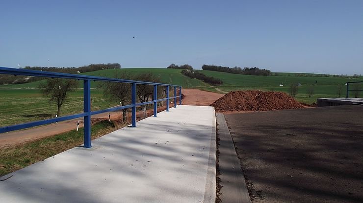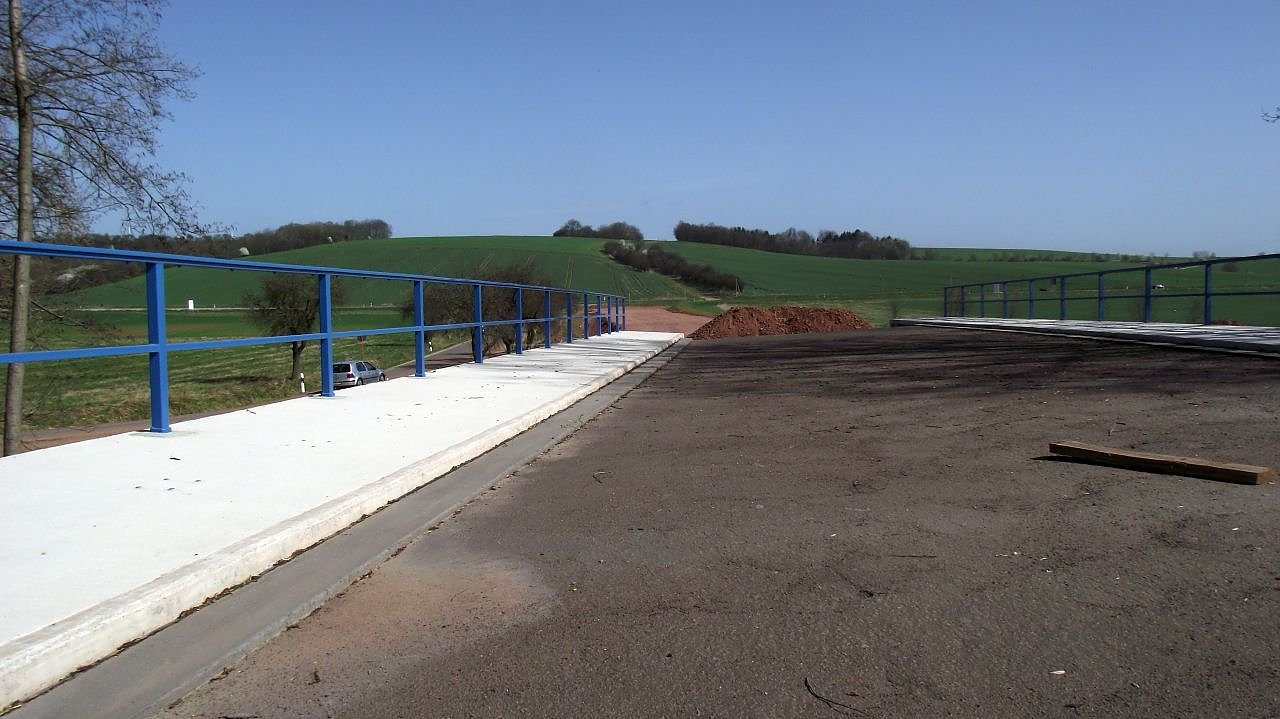 Die neu erbaute Brücke über die Helme ist 22 Meter und damit ein Vielfaches breiter als das alte Bauwerk wenige Meter daneben. Sie führt parallel der alten Straße, deren Bitumen abgetragen wird, zur B 243.