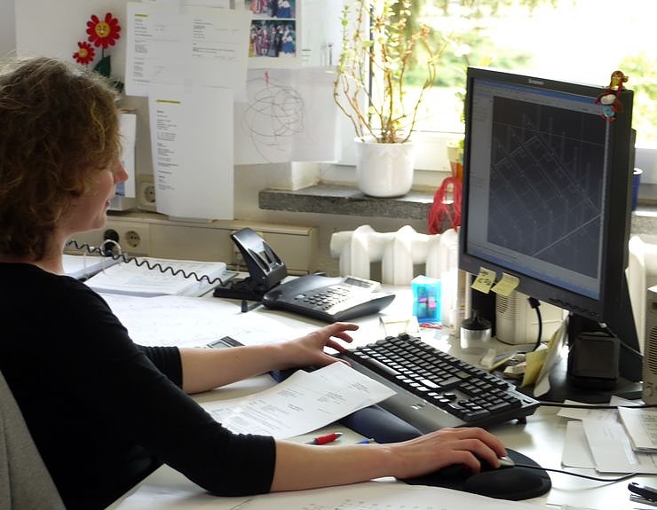 Autor: nnzBauzeichnerin Inka Jelen an einem modern ausgestatteten Arbeitsplatz im Bereich Ingenieuerbau
