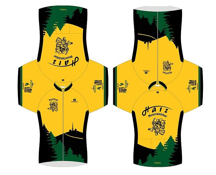 Viele Harzgemeinden vereinen in ihren Ortswappen und Flaggen diese Grundfarben Grün-Schwarz-Goldgelb. Die Hexe ist klar - umspukt einen immer irgendwo im Harz. Der Brocken - das höchste im Norden durfte natürlich nicht fehlen. Und die Arme werden von einem Mountainbiker, im Trail surfend, geziert. Auf der Brust wird das Trikot mit einem individuellen Namenszug personifiziert