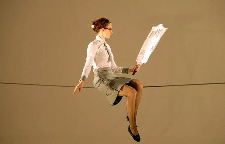 So präsentiert auf dem Rathausplatz das Lufttanztheater Berlin mit der Schweizer Artistin Aniko den Alltag einer gestressten Sekretärin, die mit zwei Telefonen auf einem Drahtseil versucht, trotz aller Missglücke und Schwierigkeiten perfekt zu funktionieren.