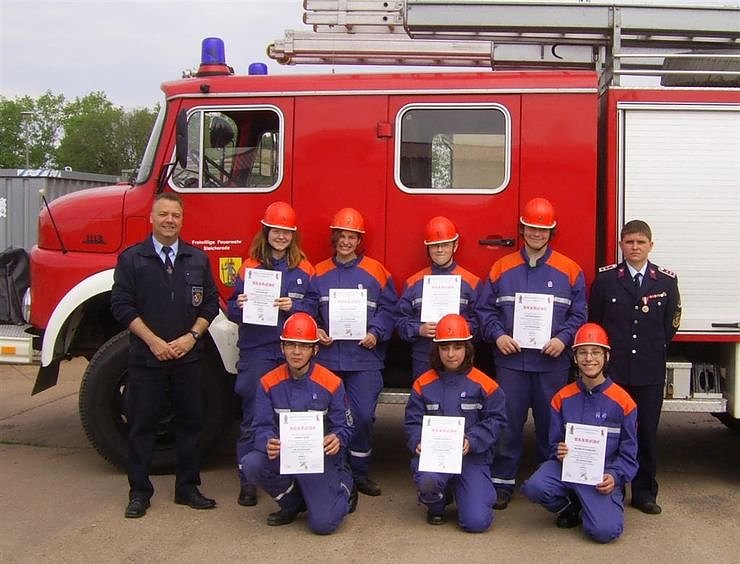 Da die Jugendflamme eine Vorstufe der Grundausbildung in der Feuerwehr darstellt, ist sie für den Nachwuchs der erste Schritt zur aktiven Wehr, sagt Kreis-Jugendfeuerwehrwartin Manja Bernsdorf. Der Sinn und Zweck dieses Abzeichens mit den Stufen 1 bis 3 der Flamme ist, dass die Jungkameraden bei der Aufnahme ein gutes Grundwissen haben. Nicht nur theoretisches Wissen wurde abverlangt, sondern viele praktische Handgriffe und die Erklärung von einzelnen Gegenständen. Unter den kritischen Blicken der Prüfer, Kreis-Jugendfeuerwehrwartin Manja Bernsdorf und Kreisbrandinspektor Wilfried Ittershagen meisterten die Floriansjünger jede Aufgabe. Nach umfangreichen Fragen aus verschieden Wissensgebieten, wie zum Beispiel, wie lang ist ein Steckleiterteil oder in welcher Stärke wird die Grundübung durchgeführt, nahmen die Jungkameraden die praktische Prüfung in Angriff. Hier mussten sie Aufgaben wie Benennen und Erklären der Ausrüstung eines Löschgruppenfahrzeuges, Auffinden eines Unterflurhydranten und Setzen eines Standrohres, Binden von fünf wichtigen Knoten und der Aufbau eines improvisierten Wasserwerfers bestehen. Weiterhin wurde das Stoffgebiet der Grundtätigkeiten geprüft. Hier galt es Druck- bzw. Saugschläuche ordnungsgemäß auszurollen, kuppeln und zu lösen.