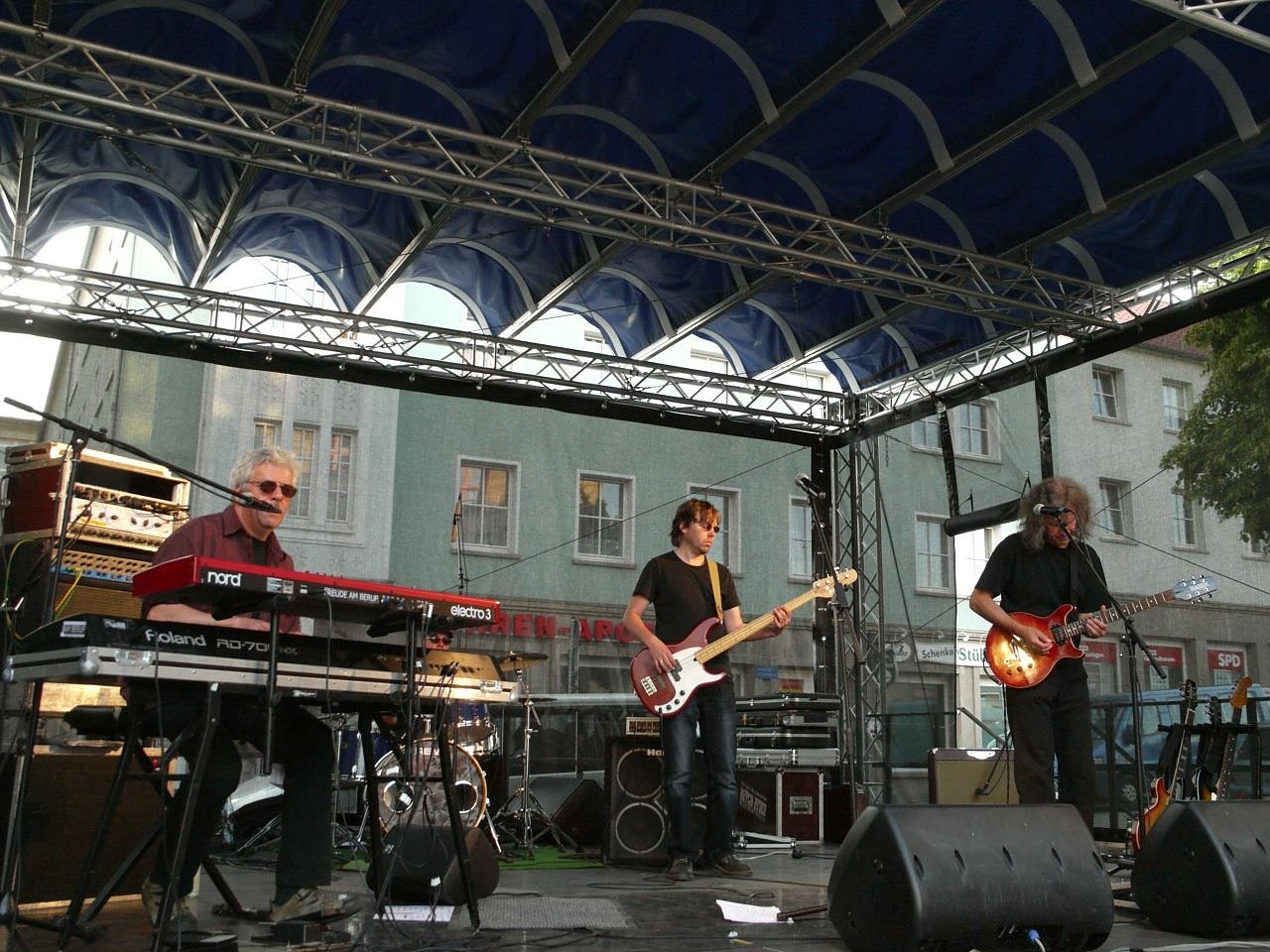 Auf dem Rathausplatz beendet die Berliner Bluesband "Engerling" den Tag der Proteste. Hier kamen heute im Laufe des Tages zahlreiche Nordhäuser zusammen, um klar zu machen, dass Nordhausen bunt ist und nicht braun. Das Fest vor dem Roland wurde durch die Thüringer Ministerin für Soziales, Familie und Gesundheit, Heike Taubert (SPD) eröffnet, die zuvor bereits auf den Veranstaltungen des BgR und ihrer Partei gesprochen hatte.