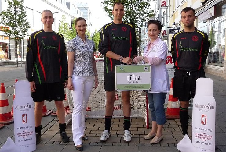 Nach der Übergabe hatten die Fußballer sich in der Fußgänger-Zone in einer für sie ungewohnten Sportart zu versuchen. Der Eishockey-Profi Daniel Rau, der im Rahmen einer Allpressan-Produktpräsentation vor der Advamed-Plus-Apotheke in der Nordhäuser seine Runden auf Inline-Skates drehte, forderte sie zu einem Freundschaftsspiel auf das wesentlich kleinere Tor.