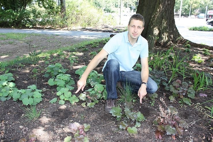 Wo jetzt Löcher sind, standen vorher Stauden-Setzlinge. Sven Gerwien ist empört über die Dreistigkeit. Denn hier wird auch Monate lange Arbeit zunichte gemacht.