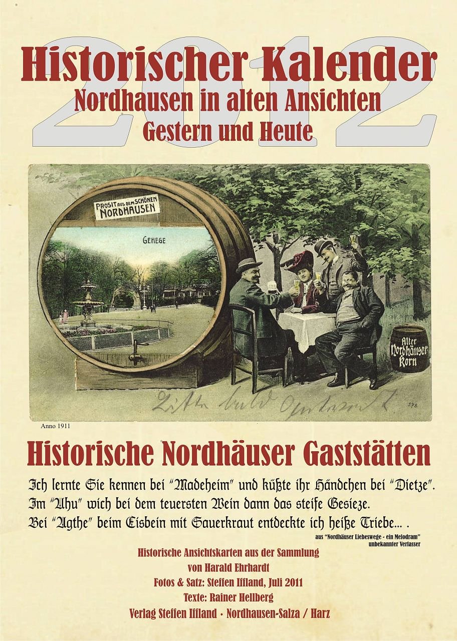 Seit über dreizehn Jahren widmet sich der Verlag Iffland in Salza u. a. der Herausgabe von Kalendern mit historischen Abbildungen von Nordhausen. Damit stieß er bei vielen Südharzern auf großes Interesse. Zum einen weil Steffen Iffland den alten Aufnahmen Fotos vom selben aus der heutigen Zeit gegenüber stellt und zum anderen auch Informationstexte beifügt. Im großzügig angelegten Kalendarium findet sich Platz für Eintragungen.Wie stets besticht der Kalender 2012 durch eine sorgfältige und interessante Auswahl von Nordhäuser Ansichtskarten, die wie schon in den letzten Jahren aus der einzigartigen Sammlung von Harald Ehrhardt aus Salza stammen. Diesmal widmet sich der Herausgeber dem Thema Gaststätten. Insgesamt werden 12 historische, teilweise noch vorhandene Lokale und Restaurants vorgestellt.