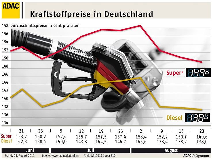 Das ist ein Rückgang gegenüber der Vorwoche um 1,1 Cent. Für einen Liter Diesel müssen die Autofahrer derzeit 1,380 Euro bezahlen, also 0,2 Cent weniger.