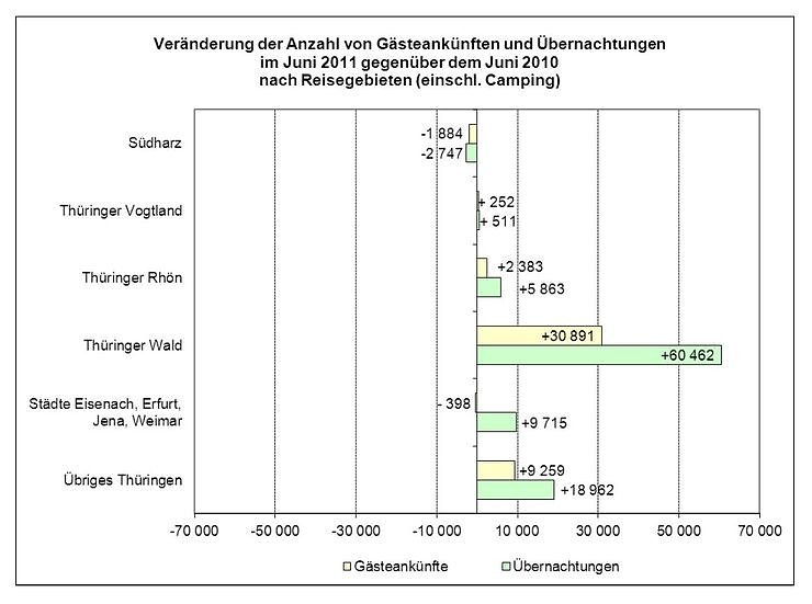Den größten Beitrag zur positiven Entwicklung im Thüringer Tourismus lieferte im Juni 2011 das Reisegebiet Thüringer Wald. So nahm die Zahl der Übernachtungen in diesem Reisegebiet um 60.000 zu (+15,3 Prozent). Die Zahl der Gästeankünfte erhöhte sich im gleichen Zeitraum um 31.000 (+24,0 Prozent). Mit fast 10.000 Gästen konnte beispielweise die Stadt Oberhof 1 200 Gäste mehr begrüßen als im Juni 2010. Die Zahl der Übernachtungen stieg dort im Vergleich zum Vorjahresmonat um 9 400 auf 36.000.