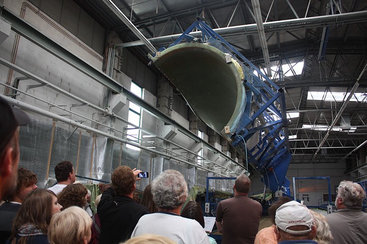 Im Anschluss an die offizielle Begrüßung führte Jürgen Simon, Produktionsleiter des Werks, die Besucher in vier Stationen durch die einzelnen Arbeitsschritte des Produktionsprozesses. Bevor ein Rotorblatt gebaut werden kann, muss ein Modell des Blattes entworfen werden, das als Vorlagenform dient. Anhand dieser Vorlage werden Glasfaserbündel verwoben, die als Grundgerüst des Blattes dienen. Dieses Grundgerüst besteht aus zwei sogenannten Booten und zwei Stegen. Die beiden Boote werden als Unter- und Oberschale zusammengeklebt. Die Stege dienen zur inneren Stabilisierung des Blattes.